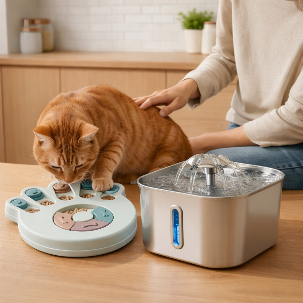 Turn mealtime into a calm little hunt. This puzzle feeder slows down fast eaters—while keeping indoor cats mentally stimulated.